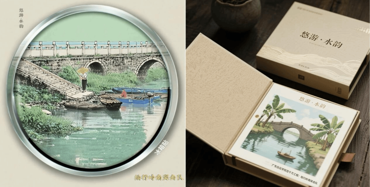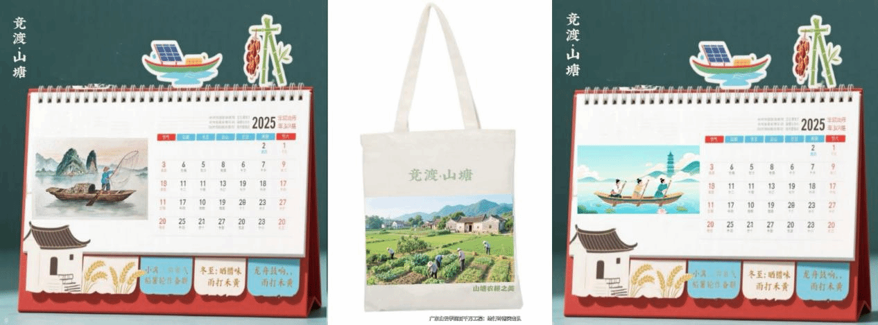 实践成果聚焦产业赋能。突击队深挖清远山塘龙舟文化核心与水乡底蕴,将采风成果转化为以龙舟精神为魂、串联山塘特色的系列文创方案。如“竞渡·山塘”系列以龙舟昂扬之姿、船桨鼓点及拼搏精神为核心元素,应用于台历、明信片、帆布袋等产品;“悠游·水韵”系列延伸至孕育龙舟文化的岭南水乡生态,将蜿蜒河网、古朴石桥等水乡意象绘入伴手礼与冰箱贴等设计,呈现静谧悠然的生活美学。“丰饶·乡土”系列则将山塘特色农副产品元素创新融入包装设计或文创开发,实现文化赋能产业。后续,团队将持续开发龙舟节庆衍生品与旅游纪念品,为农产品升级与文旅开发提供根植本土的美学方案与产业化路径,探索艺术设计服务地方经济的“山塘模式”。