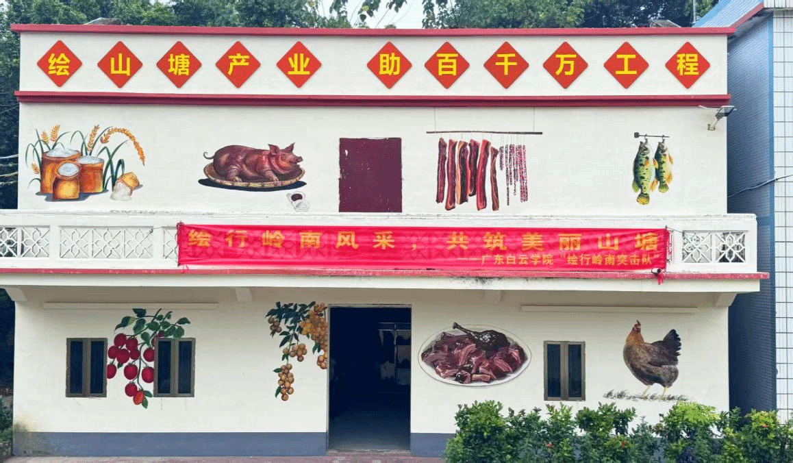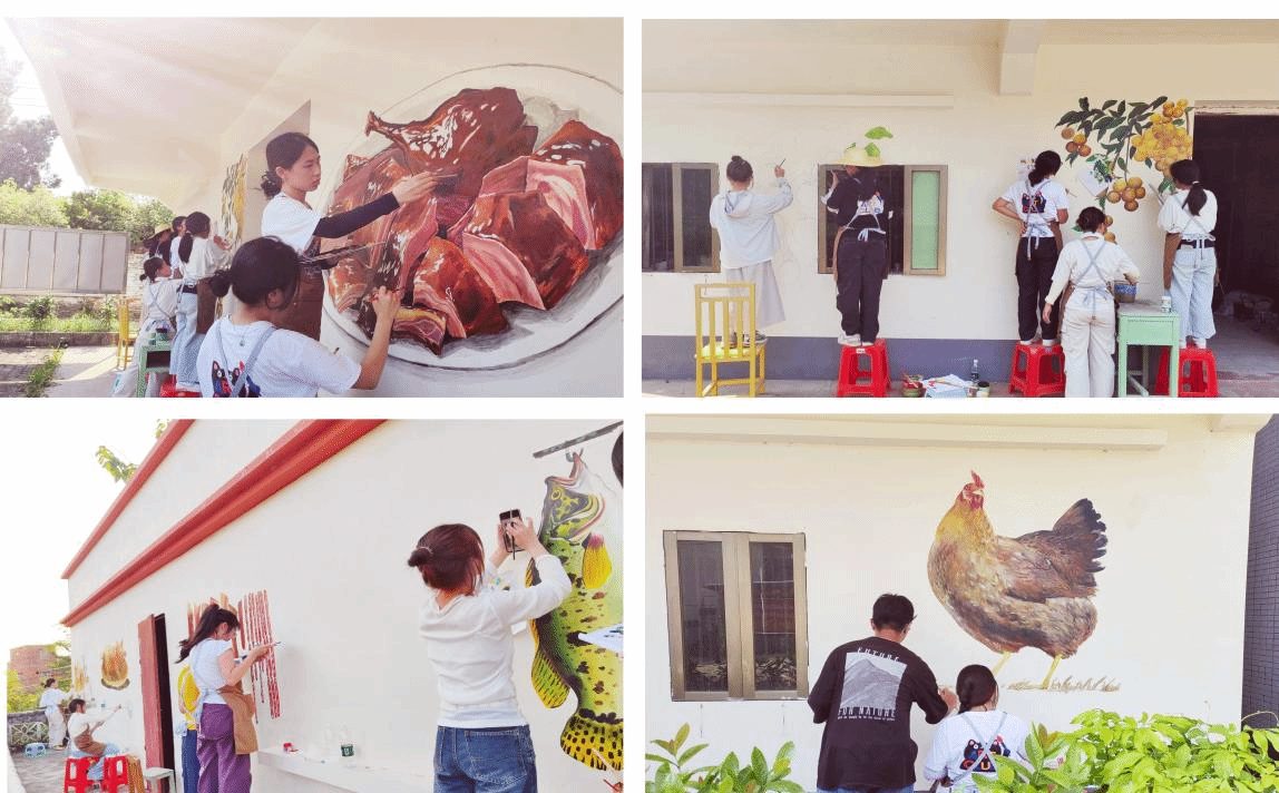 进驻山塘镇岗坳村后,突击队在专业老师翁润鹏的带领下迅速投入核心任务——大型主题墙绘创作。面对粗糙墙面,队员们凭借专业素养和顽强毅力,精准起稿勾勒“山塘八珍”轮廓,汗水浸透衣衫仍争分夺秒匀涂上色,细笔精雕力求质感逼真。短短数日,八幅色彩斑斓、充满烟火气与地域特色的“山塘美食长卷”跃然墙上:金灿灿的稻穗传递丰收喜悦,憨态可掬的烧乳猪与清远鸡令人垂涎,累累的龙眼果实挂满枝头,醇香的烧腊肉与腊肠唤起乡愁,银鳞闪耀的桂花鱼、油亮诱人的乳鹅、鲜红欲滴的小番茄点缀其间。村民们纷纷驻足赞叹:“这就是咱村的味道!”这些墙绘不仅美化了村容村貌,更直观生动地宣传了山塘特色农产品,为产业振兴注入了澎湃的“视觉动能”。