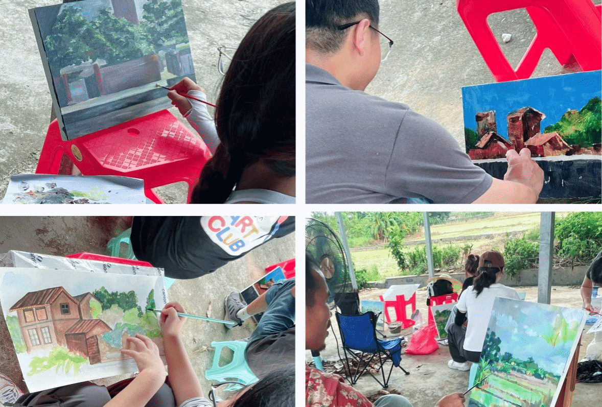 除墙绘外,队员们背起画板,深入村巷阡陌、北江河畔,用敏锐的艺术视角捕捉山塘蝶变之美,创作了大量饱含深情的写生作品。随后,“最美山塘——师生写生创作展”在承载着深厚民俗底蕴的龙舟文化广场精彩亮相。一幅幅描绘清新山水、田园风光与淳朴民生的画作,吸引了众多村民驻足欣赏。他们兴奋地指认画中熟悉的场景与物产(烧猪、桂花鱼、龙舟),发出“看着就能吃下两碗饭”“快看,是咱们这里的鱼!”的由衷赞叹,更有老人感慨:“没想到每天见的捕鱼场景能这么美!”这场展览不仅是一场艺术盛宴,更是一次成功的乡土美育实践,极大地增强了村民对家乡新貌的自豪感与文化认同感,实现了艺术与乡土的“双向奔赴”。