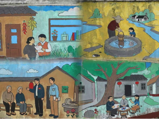 “每一面墙都是一个故事载体,每一笔色彩都是一次文化传播。”在创作“人心向聚暖”板块时,队员吴静雯特意加入了村民围坐分享丰收果实、村委干部讲解政策的场景,“这是我们调研时看到的真实画面,希望通过画笔让更多人感受到井塘村‘党群同心’的凝聚力。”而“岁月皆安恬”中老人树下摇扇的悠闲、“庭院四季美”里春有花、秋有果的景致,则用细腻的笔触勾勒出乡村生活的平和与美好,让观者瞬间get到“此心安处是吾乡”的归属感。