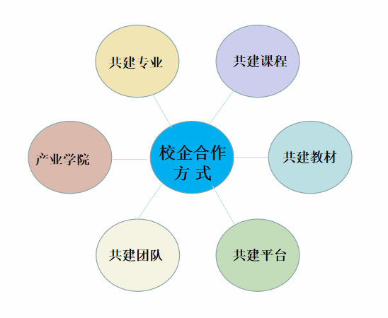“产业学院”建设是产教融合、校企合作的重要载体,“六共建”(共建学院、共建专业、共建课程、共建教材、共建团队、共建平台)是产业学院建设的重要一环,也是真正落实校企协同育人(“3+1”)人才培养模式改革的重要抓手。“六共建”在具体产教融合实践中,表现为六种主要校企合作方式,具体如下图:
